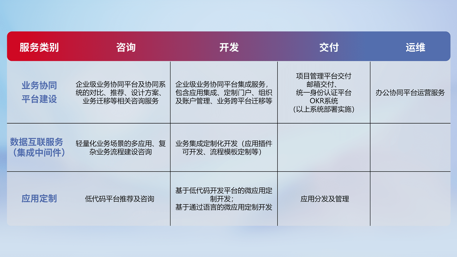针对钉钉、、、、企微、、、、IDaas等平台级产品提供产品的规划、、、、方案、、、、交付、、、定制化开发等服务,,实现如统一协同办公、、、、智能客户服务、、、、混合会议管理、、、智能数据查询、、、等业务场景,,实现数字化转型。。。