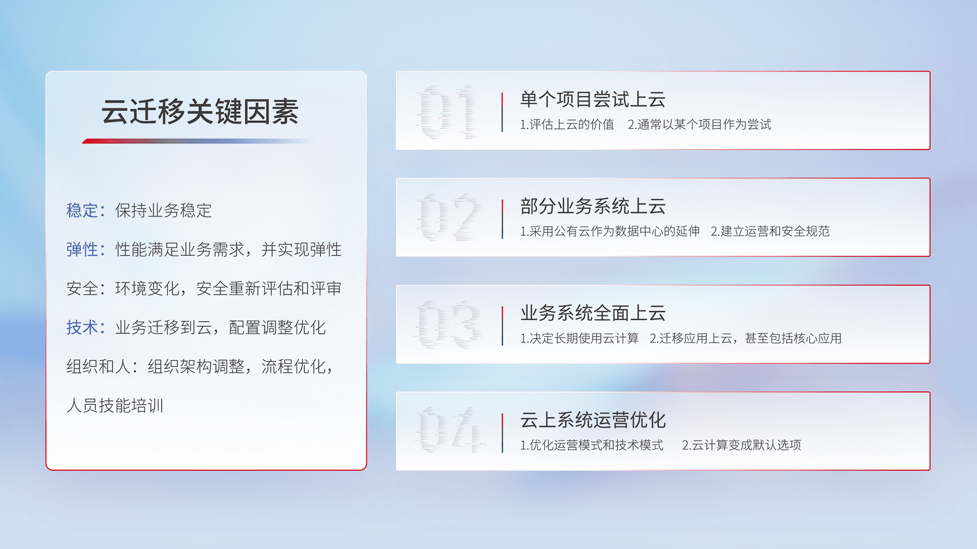 结合实际业务,,从规划设计、、云平台选型、、、、云原生改造、、数据迁移、、、集成交付,,,迁移全过程为客户识别最佳上云路径,,,做好风险识别管理,,,,设计网络架构、、、身份权限、、、、安全审计合规、、操作审计、、日志审计、、监控告警策略、、多站点容灾设计等,,对云上基础设施进行整体规划,,提升IT治理水平,,,以满足弹性、、高可用、、、、高性能的需求。。