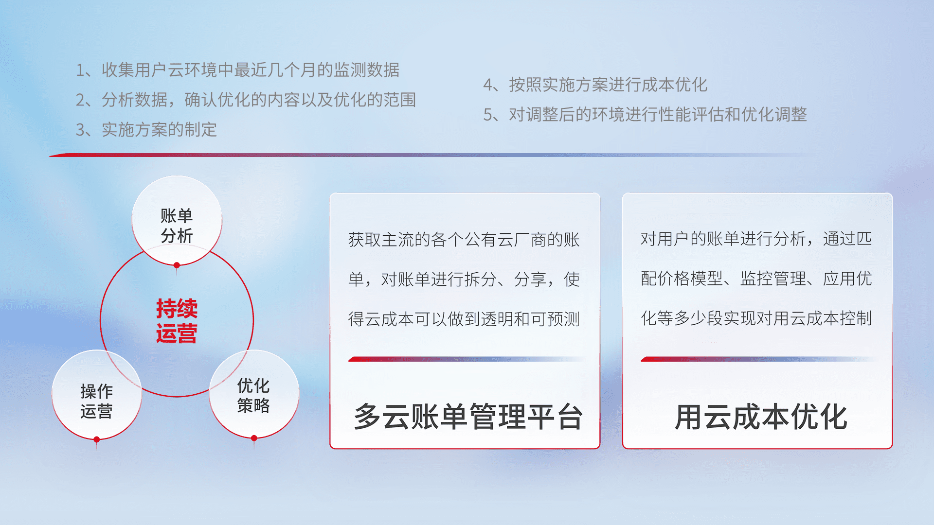 通过多云纳管,,以统一的资源数据模型把客户的云资源进行抽象和封装,,,,进而实现对多云资源的统一操作,,,,保障云资源管理的可靠性、、、稳定性与可用性。。。量身定制化运维内容,,,配置、、开发运维、、、补丁管理、、、、备份、、、、监控、、、认证和访问管理、、、、审计和日常巡检等,,,,保障在用云过程中的可靠度,,,,稳定度以及高可用率。。。。